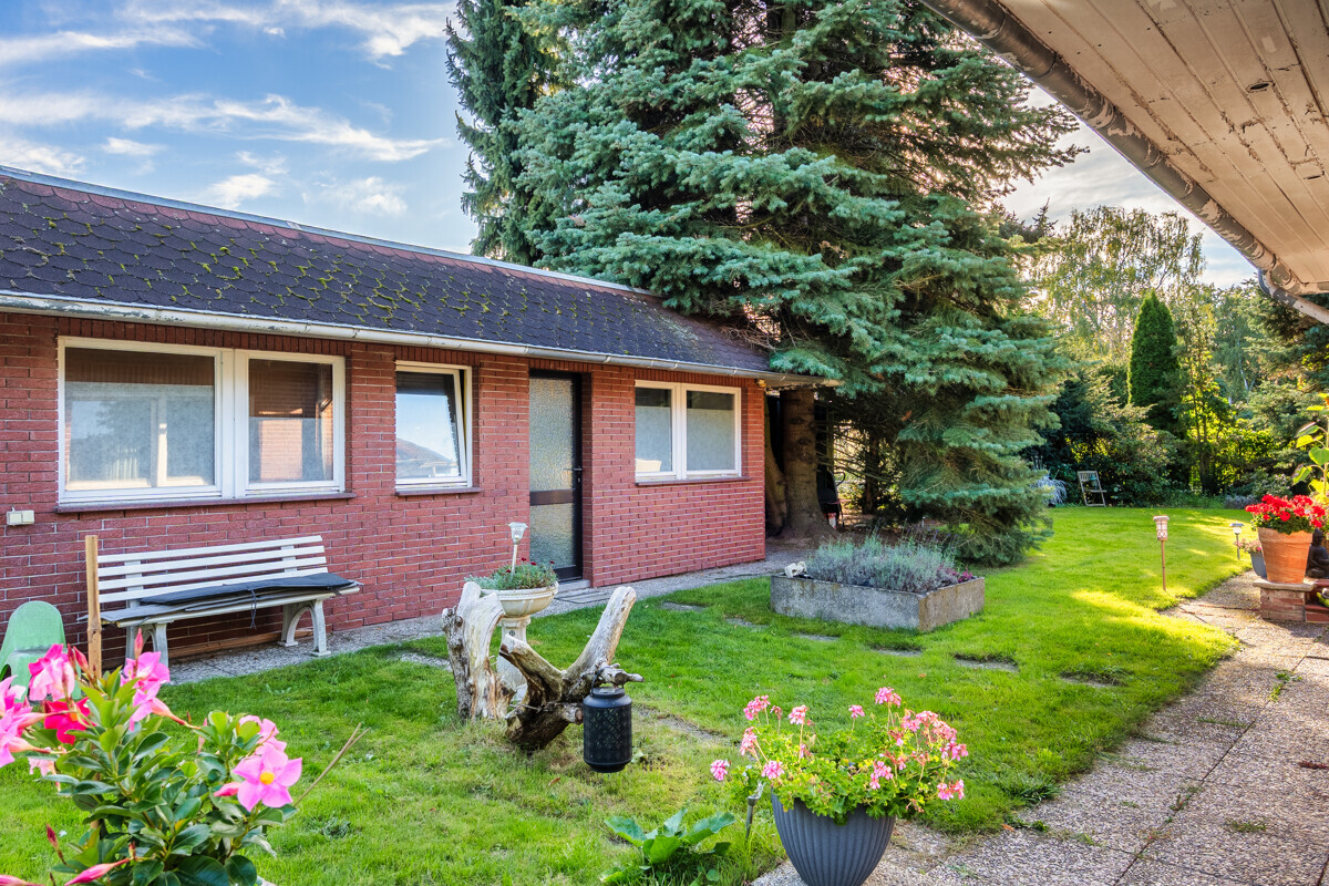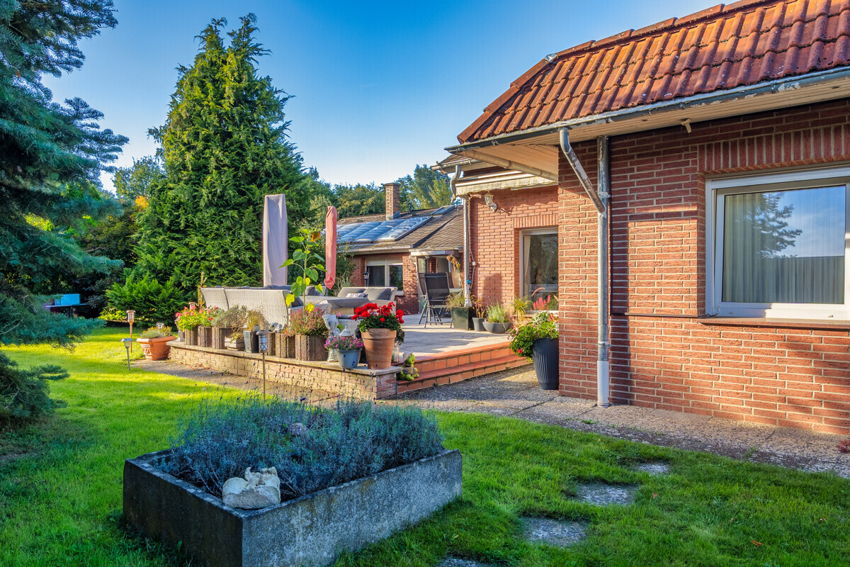 Im gepflegten Garten befindet sich ein eingelassener Pool (Prüfung Technik - Umwälzpumpe nötig) mit Überdachung sowie ein massiver Schuppen.