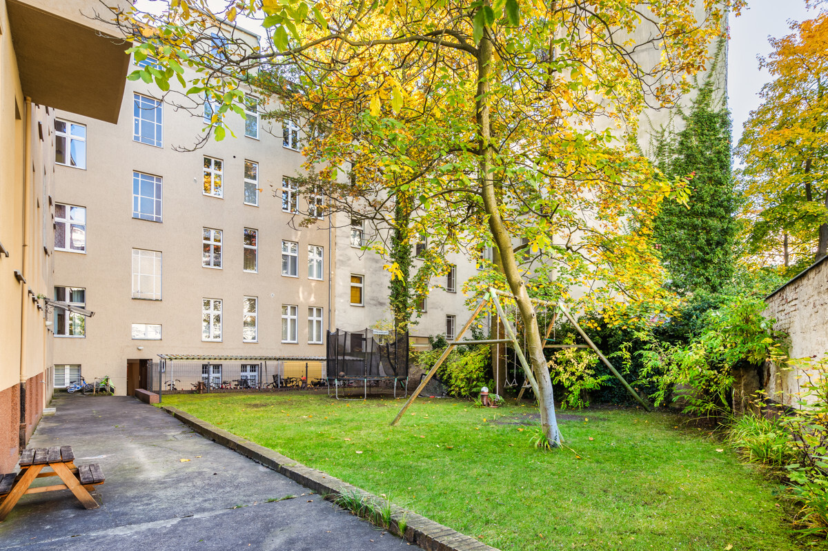 Der Innenhof wird gemeinschaftlich benutzt und bietet eine kleine grüne Oase mit Spiel- und Entspannungsmöglichkeiten.