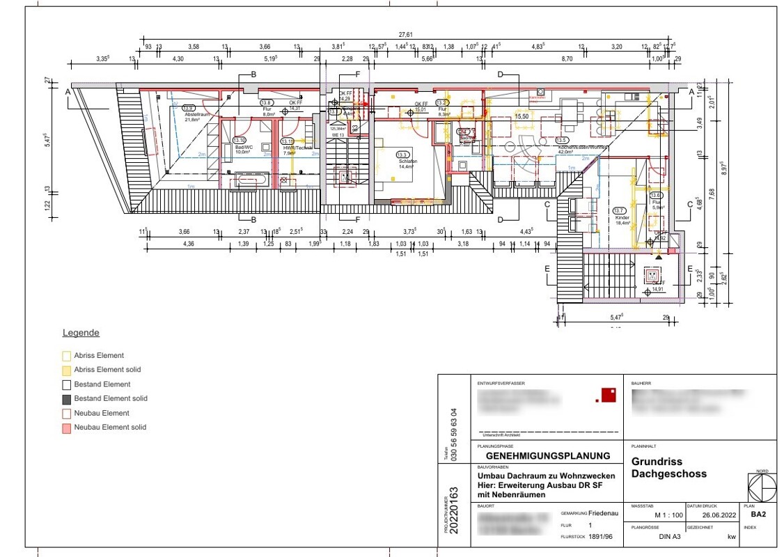 Baugenehmigung:Die Baugenehmigung Nr. 2022 / 1917 gemäß §63 BauO BIn zum Umbau von Dachraum zu Wohnzwecken (Erweiterung Ausbau DR SF mit Nebenräumen) wurde am 26.01.2023 erteilt. Sie gilt auch für den Rechtsnachfolger des Bauherrn. Die Baugenehmigung erlischt, wenn innerhalb von zwei Jahren nach ihrer Erteilung mit der Ausführung des Bauvorhabens nicht begonnen wurde oder das Bauvorhaben nach Ablauf von sechs Jahren nach ihrer Erteilung nicht fertig gestellt worden ist. Die Frist kann bezüglich des Ausführungsbeginns auf Antrag dreimal, jeweils bis zu einem Jahr verlängert werden.