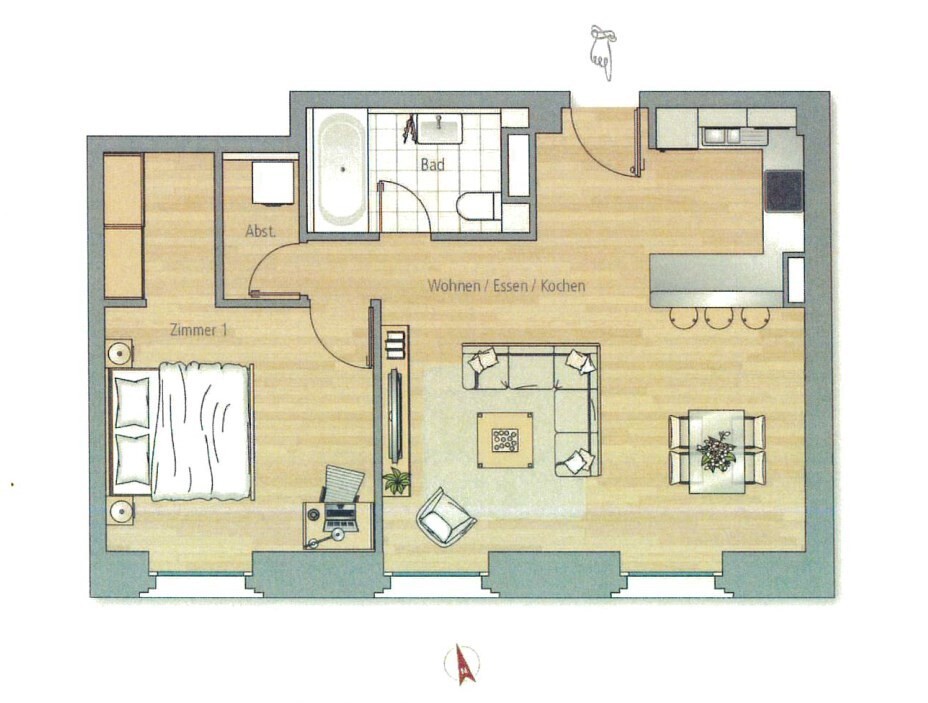 Auf einer Wohnfläche von ca. 59 m² bietet die Wohnung eine hervorragende Aufteilung mit einem großzügigen Wohn- und Essbereich und offener Küche.