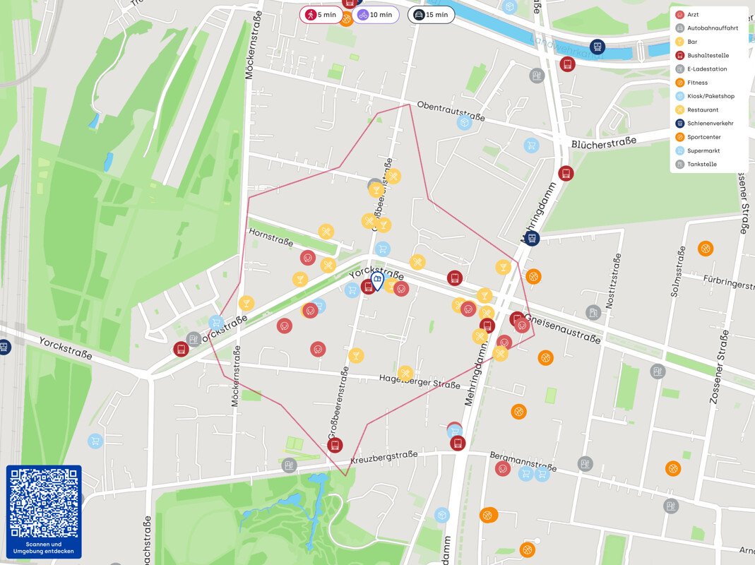 Die Gewerbeimmobilie in der Yorckstraße / Ecke Großbeerenstraße in Berlin Kreuzberg bietet eine hervorragende Lage für Unternehmen, die von einer optimalen Infrastruktur profitieren möchten. In unmittelbarer Nähe befinden sich zahlreiche Anbindungen an den öffentlichen Nahverkehr, darunter die U-Bahn-Station Mehringdamm in ca. 350 Metern Entfernung und die S- und U-Bahn-Station Yorckstraße in ca. 800 Metern Entfernung. Der Metrobus M13 hält vor der Haustür. Dies ermöglicht eine bequeme Erreichbarkeit für Mitarbeiter und Kunden.Diese Gewerbeimmobilie bietet eine ideale Kombination aus zentraler Lage, hervorragender Infrastruktur und einer Vielzahl an Annehmlichkeiten in unmittelbarer Umgebung, die den Geschäftsbetrieb unterstützen und erleichtern können.