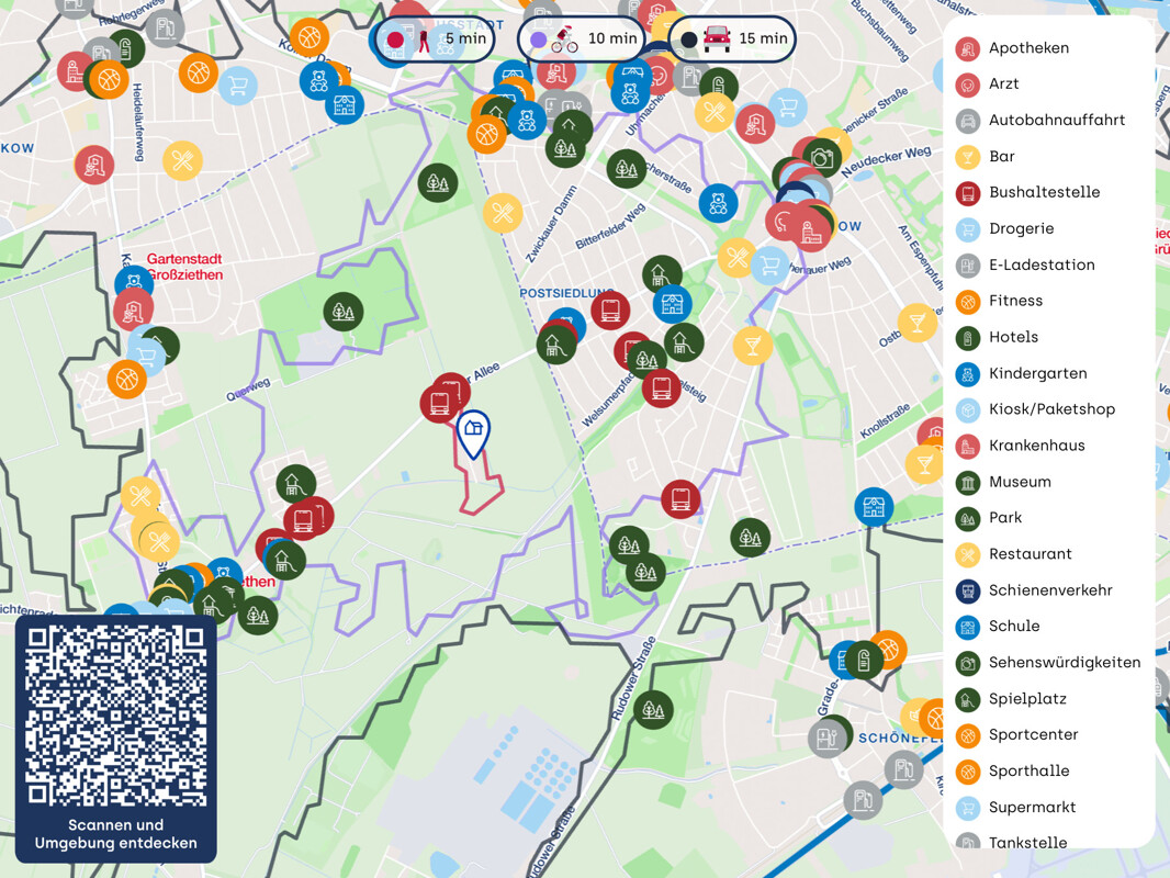 Das Einfamilienhaus liegt in ruhiger Feldrandlage im Rosa-Luxemburg-Weg in Großziethen, einem Ortsteil der Gemeinde Schönefeld im Landkreis Dahme-Spreewald. Die Lage bietet ein naturnahes Wohnumfeld mit viel Grün und hoher Lebensqualität, nur etwa 650 Meter von der Berliner Stadtgrenze entfernt. Die angrenzenden Bezirke Rudow, Lichtenrade und Buckow sind schnell erreichbar.Der Flughafen BER liegt nur ca. 13 Autominuten entfernt. Auch die Berliner Stadtautobahn A100 sowie der südliche Berliner Ring sind bequem zu erreichen. Die nächste Bushaltestelle ist nur 130 Meter entfernt, was die Anbindung an den öffentlichen Nahverkehr erleichtert.