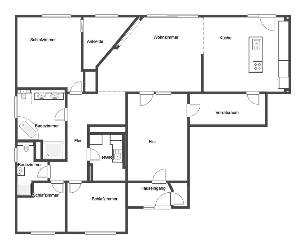 Das große Erdgeschoss bietet Ihnen modernes Wohnen auf einer Ebene: ein offener, heller Wohn- und Essbereich mit Zugang zur Terrasse, eine voll ausgestattete Küche mit Vorratsraum, drei Schlafzimmer, zwei Bäder sowie ein großzügiger Eingangsbereich.